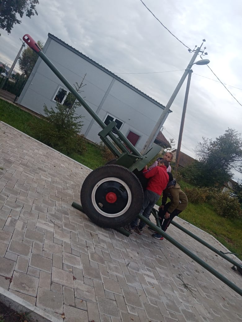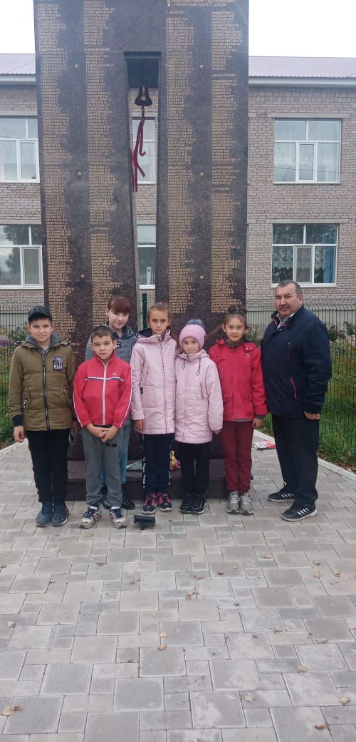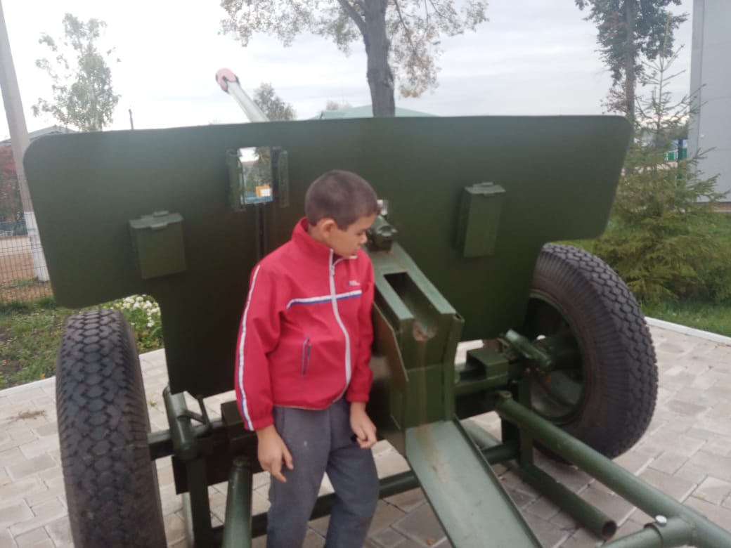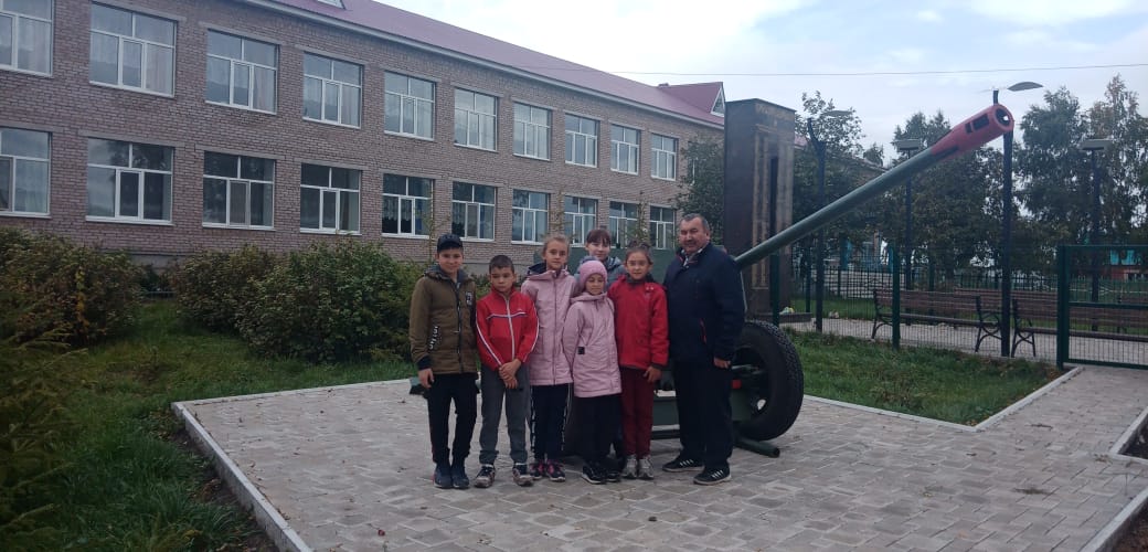 Перед школой находится муляжная пушка, отображающая оригинал боевого оружия Анвара Абдуллина. Рядом стела, с именами участников войны-жителей села. Очень красиво!