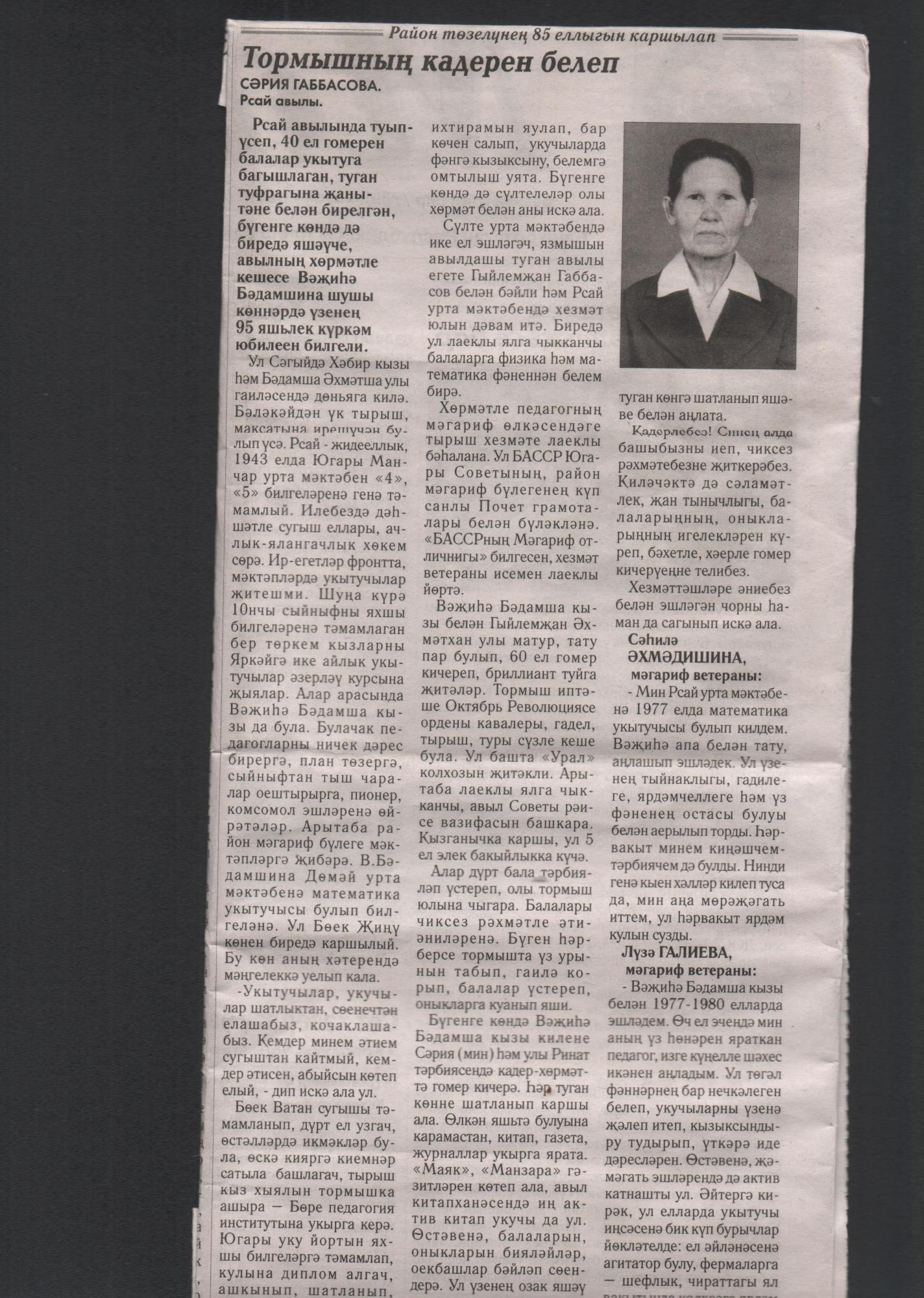 На днях наше село и коллектив школы отметили большой юбилей. Юбилей ветерана, ветерана педагогического труда, 95 летие!. Она- долгожительница. Бадамшина Ваҗиһә Бадамшиновна, Ваҗиһә апа,учитель физики и математики, всю свою жизнь, трудовую деятельность посвятила школе, воспитанию и обучению детей.(О ней и ее семье можно прочитать в прикрепленном файле или в газете “Маяк” №5, от 21января 2020 года). К этому дню мы готовились: проводили встречи с ветераном, записали интервью с ней, сняли видеоклип “Безнең авылның иң өлкән кешесе!” в рамках конкурса видеороликов «Старожилы родного села», посвященном 85-летию образования Илишевского района. В этот день дом ветерана с утра полон гостей: родные, дети, друзья и коллеги, а также коллектив школы и представители МКУ Управление образования, местной администрации. Все поздравляют, вспоминают моменты из школьной жизни, вручают памятные подарки. Было все по домашнему, уютно, без официоза, без бумаги. Ваҗиһә апа передала свои искренние пожелания и всем большое спасибо. И мы желаем ветерану веселых и добрых воспоминаний из школьной жизни, безмерной благодарности от всех родителей и учеников, полного счастья и достатка, отличного здоровья!